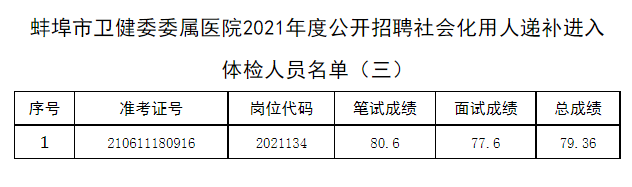 因参加蚌埠市卫健委委属医院2021年度公开招聘社会化用人部分进入政审考察人员放弃,现将递补人员名单予以公布。请递补人员于2021年11月15日上午9:00-11:30,携带本人有效身份证件到报考单位人事科(详细地址见http://wjw.bengbu.gov.cn/xwdt/tzgg/9014133.html)领取体检通知书。