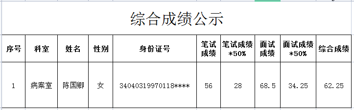 2021年8月30日发布的招聘病案室专业技术人员综合成绩公示,公示期7天。如有异议,请与安徽理工大学第一附属医院(淮南市第一人民医院)纪检监察处、人力资源处联系,联系电话:纪检监察处0554-3320728、人力资源处0554-3320707。