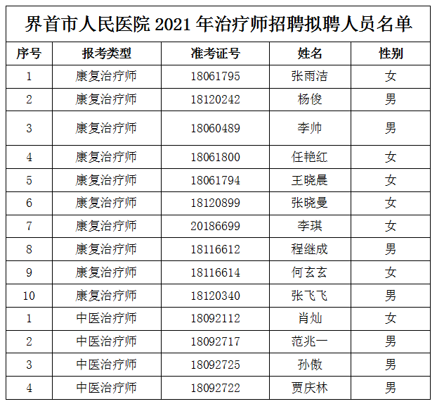 界首市人民医院2021年治疗师招聘,经笔试、面试、体检、考察等有关程序,张雨洁等14位人员符合招聘录用资格,经研究我院予以录用。现予以公示。公示期从2021年11月15日-11月19日。公示期内,如有异议,请联系:0558-2851220(界首市卫健委作风效能中心;0558-4999328(界首市人民医院纪检监察室)。