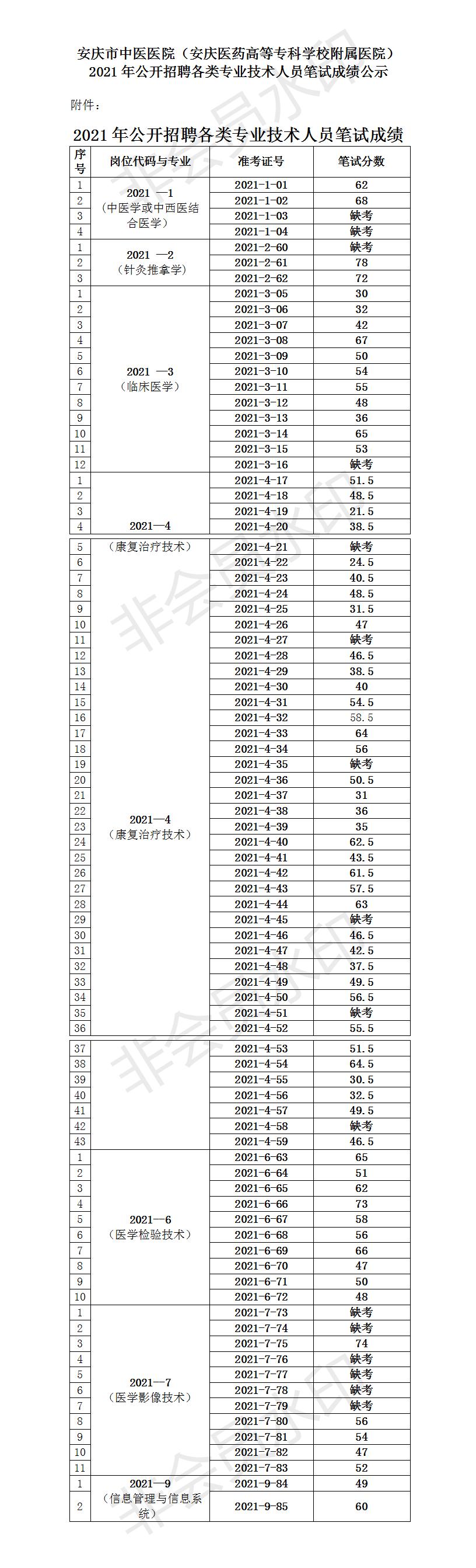 根据《安庆市中医医院(安庆医药高等专科学校附属医院) 2021年公开招聘各类专业技术人员公告》相关程序,笔试工作已结束,现对报考人员笔试成绩进行公示(详细内容附后)。