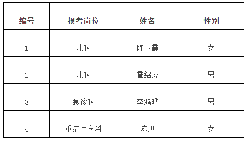 根据上级文件精神及医院招聘工作方案,临床紧缺岗位按照择优录用的原则,经过笔试、面试、体检等环节,确定以下4人为拟录取人员,现予以公示,公示时间为2021年11月15日至2021年11月21日。