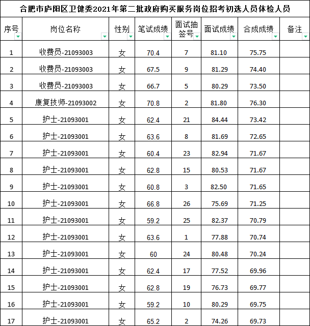 根据《合肥市庐阳区卫健委2021年第二批政府购买服务岗位招考公告》(2021-10-12)的规定,经过报名、资格审核、笔试(或专业测试)、面试等程序,现将进行体检程序的初选人员名单及相关事宜通知如下:
