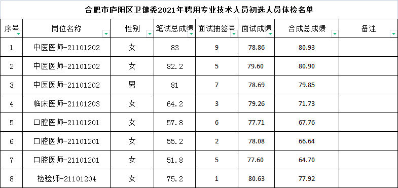 附件:合肥市庐阳区卫健委2021年聘用专业技术人员初选人员体检名单