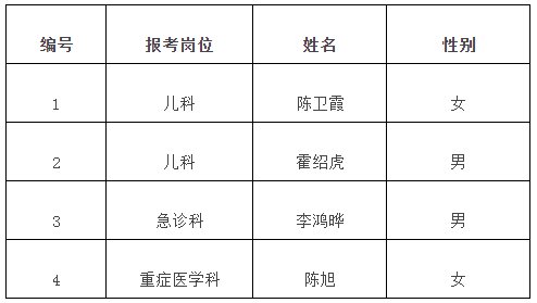 根据上级文件精神及医院招聘工作方案,临床紧缺岗位按照择优录用的原则,经过笔试、面试、体检等环节,确定以下4人为拟录取人员,现予以公示,公示时间为2021年11月15日至2021年11月21日。