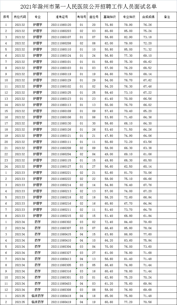 请符合《2021年滁州市第一人民医院公开招聘工作人员公告》中岗位代码为202132、202133、202134、202035的面试人员于2021年11月19日前到南区人事科领取面试通知书,面试名单见附件。其他岗位面试时间另行通知。