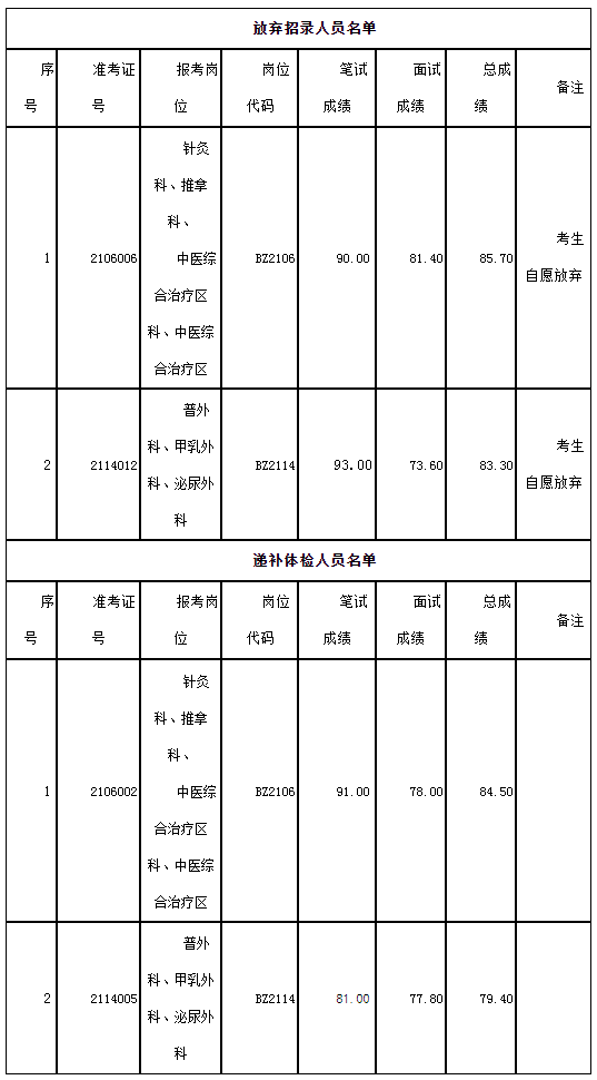 根据《安徽中医药高等专科学校附属医院/芜湖市中医医院2021年公开招聘编内工作人员公告》规定,因出现考生自愿放弃招录资格情况,现将芜湖市中医医院公开招聘编内工作人员递补体检人员有关事项通知如下: