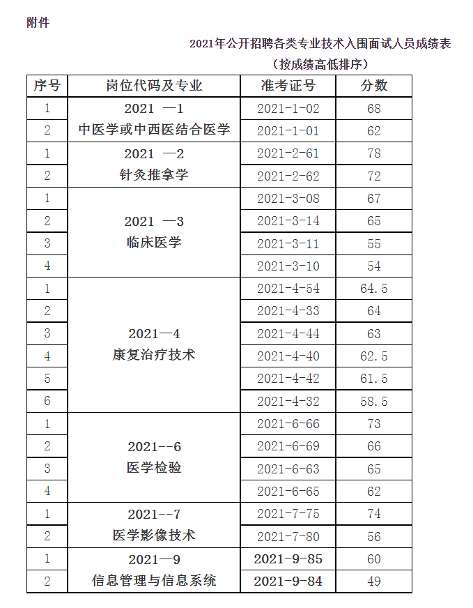 根据《安庆市中医医院(安庆医药高等专科学校附属医院) 2021年公开招聘各类专业技术人员公告》规定,经现场报名、资格审查、笔试等环节,按照成绩从高到低顺序,确定和公布入围面试人员名单(见附件)。请进入面试的考生于2021月11月21日上午8:00前携带本人身份证、准考证原件到安庆市中医医院北院区(安庆市宜秀区集贤北路1588号)九楼缴纳面试费80元/人后,到候考厅抽签候考。上午9:00正式面试,逾期不到者视为自动放弃。