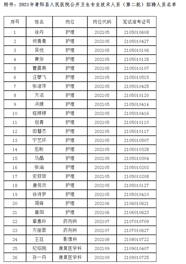 根据《2021年青阳县人民医院公开招聘卫生专业技术人员(第二批)公告》,经过资格复审、笔试、专业测试、体检、考察等环节,徐丹等26名考生符合相应招聘岗位条件,确定为拟聘用人员。现对拟聘用人员(见附件)进行公示。