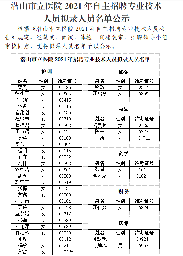 【拟录人员名单】潜山市立医院2021年自主招聘专业技术人员拟录人员名单公示