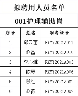 三、因准考证号RMYY2021A004的考生自愿放弃,根据《和县人民医院2021年公开招聘派遣制工作人员公告》的相关规定,递补至准考证号为RMYY2021A009的考生。以上递补考生已参加体检及考察相关程序,符合拟聘条件可办理入职。