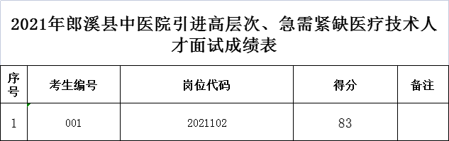 根据《2021年郎溪县中医院引进高层次、急需紧缺医疗技术人才公告》,现将2021年郎溪县中医院引进高层次、急需紧缺医疗技术人才面试成绩公布(详见附表)。