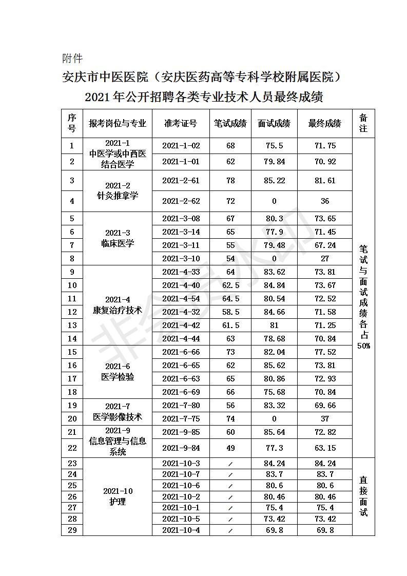 根据《安徽省事业单位公开招聘人员暂行办法》(皖人社发[2010]78号)和《安庆市中医医院(安庆医药高等专科学校附属医院)2021年公开招聘各类专业技术人员公告》,经过资格审查、笔试、面试等程序,现将进入面试的考生最终成绩予以公示(见附表)。