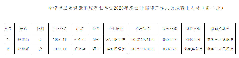 根据《事业单位人事管理条例》、《蚌埠市卫生健康系统事业单位2020年度公开招聘工作人员公告》等规定,考生段娟娟、徐鹏琛因怀孕部分体检项目延期检查,现所有体检项目已检查完毕,体检合格且考察合格,确定为拟聘用人员,现予以公示,公示期7天, 2021年11月22日至11月28日。如有问题,请于公示期间及时向市卫健委、市人力资源和社会保障局反映。