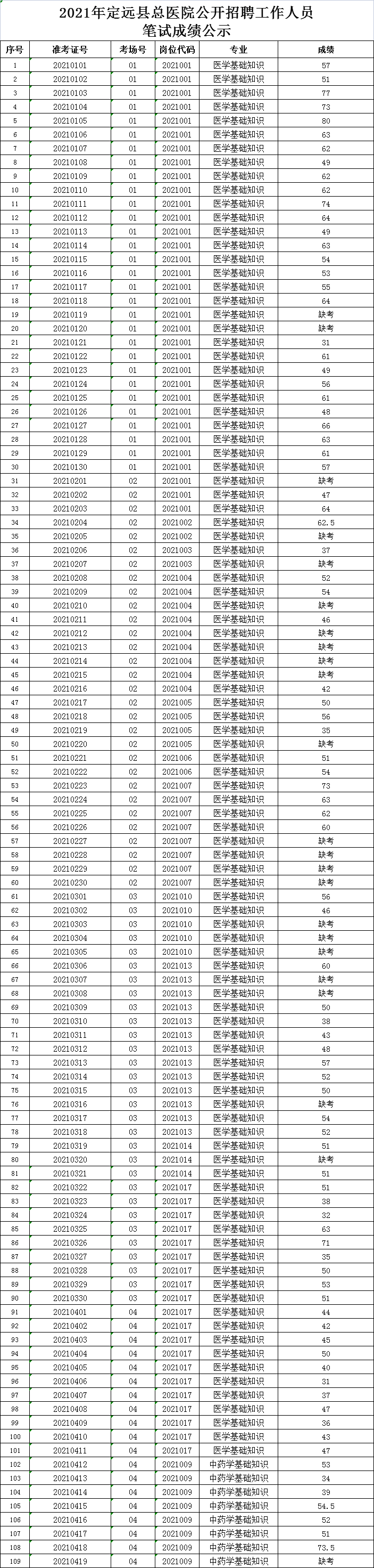 附:2021年定远县总医院公开招聘工作人员笔试成绩公示