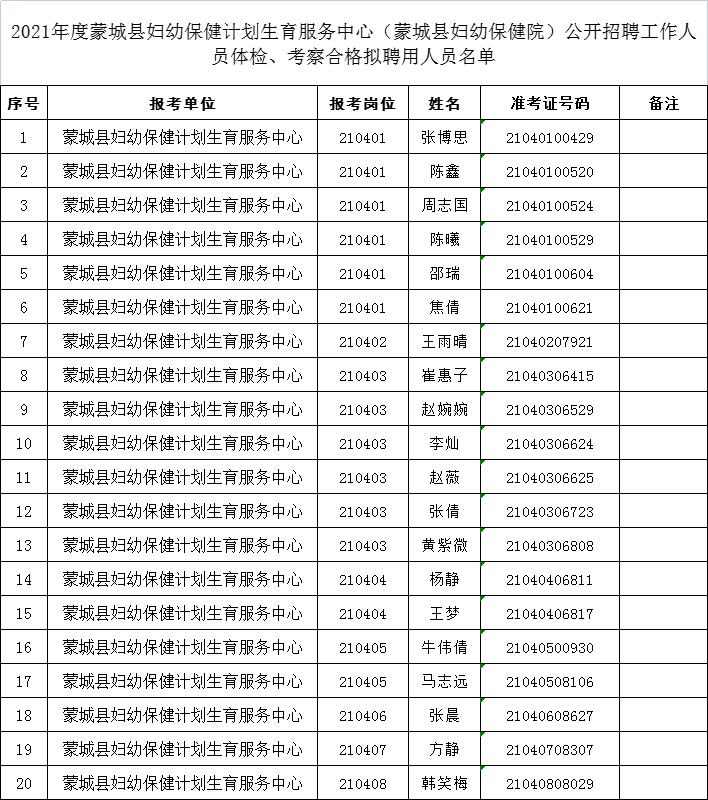 按照《2021年度蒙城县妇幼保健计划生育服务中心(蒙城县妇幼保健院)公开招聘工作人员公告》要求,经过笔试、资格复审、面试、体检和考察等程序,现将拟聘用人员名单(见附件)在蒙城县人社局政务公开网、蒙城县卫健委政务公开网、蒙城人事考试网进行公示,接受社会监督。