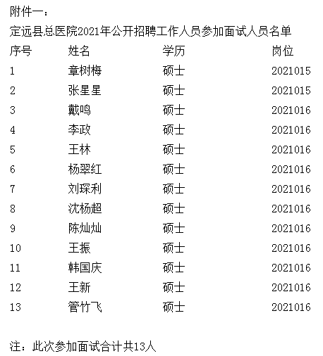 根据《2021年定远县总医院面向社会公开招聘工作人员公告》,本次参加面试人员共13名(参加面试人员入围名单见附件)。